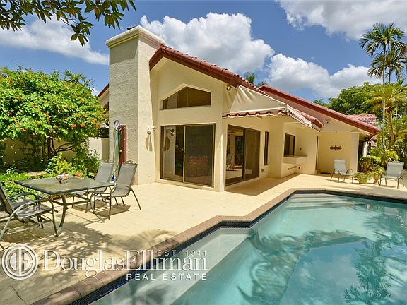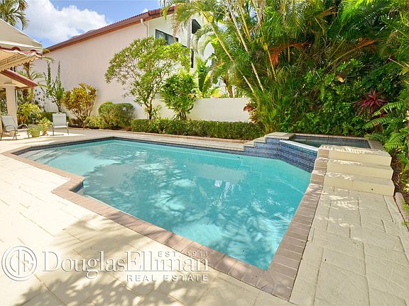 Beautifully updated Antigua model pool home situated on private lot w/south exposure. Brazilian cherry floors throughout. Great floorplan offers two master suites plus den/office. Open kitchen with granite countertops & stainless appliances. Formal living room with Coral fireplace. Knockdown ceilings/walls & granite bar. Master suite offers walk in closet, bright open master bath with updated tile floors, dual sinks, separate tub and shower. Updated guest bath with granite & wood vanity. A/C replaced in 2010. Tropical pool & patio w/waterfall. Hurricane garage door in 2009. Home has gas but not hooked up currently. Lushly landscaped courtyard entry. 24 hour manned gate. Close to tennis, Greenwise Publix, shops & more. Short distance to I95, Turnpike & the best schools & universities.