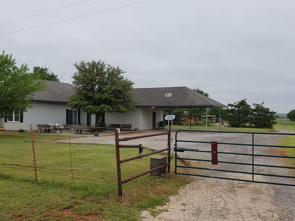 Bedrooms are very large each with an attached bath. House has many new upgrades such as windows, roof, AC/Heat units w/ducting. New water heater, electrical up to date, well house pump and pressure tank only 5 years old. House is electric and ONG. It is fenced on all 4 sides of the 6.2 acres, and has a gated entry. All 6.2 acres is well established Bermuda. There are water hydrants throughout the 6.2 acres. 1250 sq. ft. Barn with new roof. Has concrete floor, electric and water hydrant. Attached to barn is a 1400 sq. ft shed. 360° views. If you want a home in the country, this is the one. The ONLY thing this house needs is new carpet and fresh paint on the walls. This is cosmetic and usually would want to be customized by buyer. This house has been a constant work in progress since it was moved to this location in 1983. Custom moldings and door and window trim. Custom cabinets throughout home. All lower cabinets in kitchen have slide out drawers.