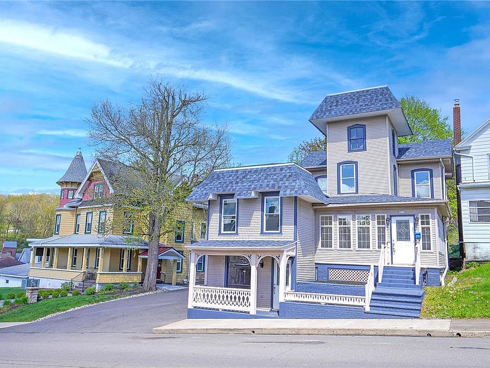 This modern Victorian offers contemporary substance and style with lovingly maintained and restored original touches over four levels! Dual front entrances welcome you to the lower and main levels. The main level begins with a spacious, L-shaped sun porch offering access to a sitting room with an original fireplace and entry to the stair hall, a grand curved staircase soaring upwards. The sitting room and formal dining rooms both feature original embossed wallpaper which had been gently painted in a neutral tone with new flooring throughout. To the front, a short run of steps leads to a mezzanine with office, bedroom, and full bath. To the rear, a second stair and updated kitchen featuring ceramic tile floor, quartz counter, tile backsplash, stainless appliances with patio and yard access. The lower level offers potential double family room, laundry facility, basement access, and a back door leading to the patio above and side entry. The second story begins with a spacious, bright landing leading onto two beds joined to the rear by a hall with ample storage and a full bath brimming with original details, including another stained-glass window. A second-story deck completes this level. The uppermost story is a tower room offering 10.5’ ceilings and is an ideal retreat room with beautiful views in three directions! With new elements, including the roof (2024), throughout this home offers the peace of mind of “new,” while the ample original detail offer charm in abundance.