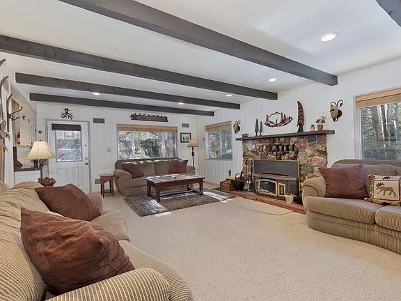 Beautiful home nestled among the towering pines in June Lake. Backing to the vast Inyo National Forest, adventure awaits right outside your front door. This rustic property has many original features, including a masonry fireplace, wood beam accents, built in sauna and great views. The main floor features the kitchen, dining area, and living room, along with the primary bedroom suite, second bedroom and full bath. You can even hear the sound of the neighboring stream from the bedrooms! Upstairs is a spacious loft with a large bathroom. The lower level has a bedroom, large game room and tons of storage. This home comes with a detached 5 car garage with room for all of your boats, snowmobiles and toys. There is space above the garage for potential additional living space. This property is one of a kind and priced to sell! Call to see this home today.