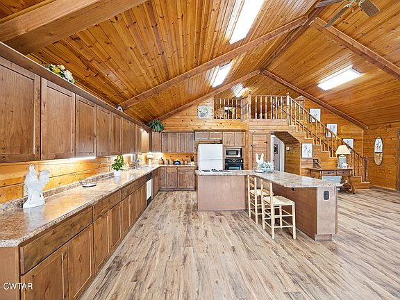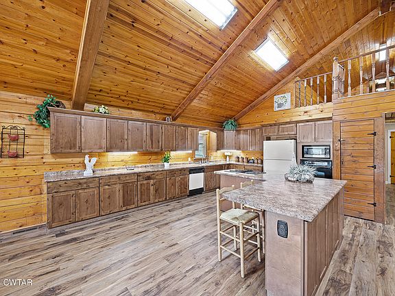 This unique log home, sits on 2 acres, offers rustic charm with modern updates, just minutes from Jackson’s amenities. A long driveway leads to the serene property, ensuring privacy and tranquility. Inside, the open-concept design showcases soaring ceilings and a large beautiful stone fireplace, filling the space with natural light from numerous large windows. The primary bedroom, located off the living room, features an en-suite bathroom and a spacious walk-in closet. The guest bedroom also offers a large walk-in closet and easy access to the hall bath. Fresh paint and newer floors in the bedrooms, hall, and bathrooms add a crisp, updated feel throughout these spaces. The kitchen is designed for both style and function, with newer cabinetry, modern floors, an island with a breakfast bar, an electric cooktop, and ample cabinet space. Upstairs, a generous bonus room offers versatile space for a home office, entertainment area, or additional guest room, complete with a half bath. The property also features a durable metal roof and a two-car garage with an additional toy garage, providing ample storage for vehicles and recreational equipment. This home combines the charm of log home living with modern conveniences, making it a true retreat in Jackson, TN.