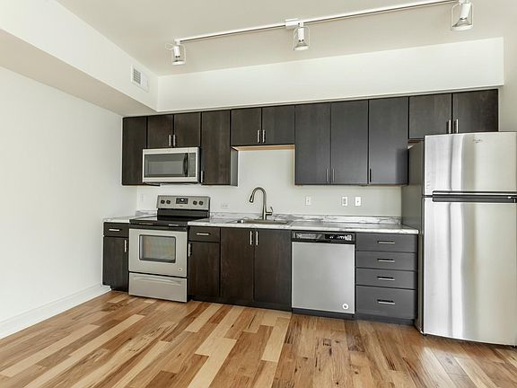 Third-floor residence located in a loft-style apartment building with elevator access; central air conditioning; hardwood floors; high ceilings; open kitchen with stainless steel refrigerator, range, microwave and dishwasher; private washer/dryer in apartment; garage and off-street parking available for an additional monthly fee Resident is responsible for electric, water, and sewage.
