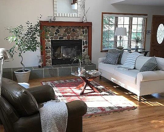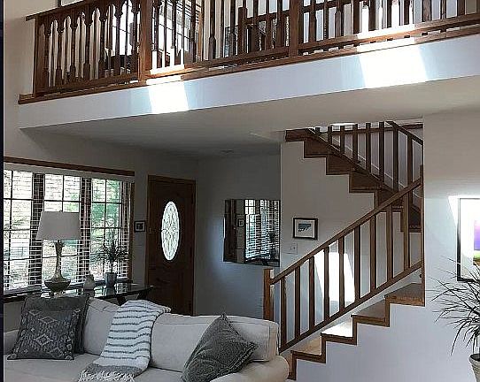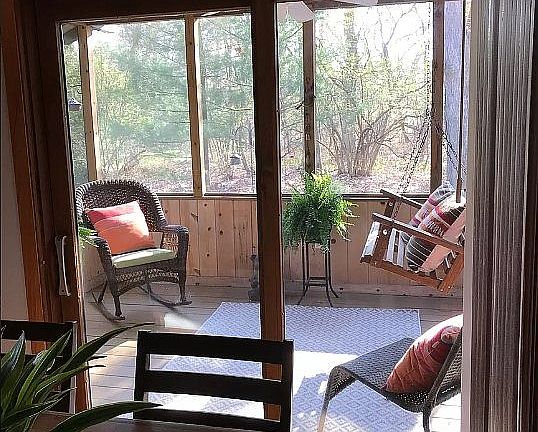 Charming, custom built contemporary/rustic home, nestled in woods by Michiana Shores and Lake Michigan. Features 2 bedroom suites, with loft and extra room, up. Hardwood flooring throughout 1st level, multiple skylights and light-washed pine volume ceiling rises to 2nd floor, lending a light , airy space to this beautiful home. Updated, well-maintained with custom cabinetry reflecting character of area in kitchen, new refrigerator/slide-in gas range, backsplash, and water filtration system. Living room: gas-converted fireplace with hand-picked stones and slate hearth adding to the warm, cozy ambiance. Master bedroom suite down accommodates queen or king bed, master bath jacuzzi tub, separate shower, updated lighting, quartz sink. Bedroom space up, includes plenty of light, dormers/angles adding to unique design. Laundry room/2.5 baths additional plus. Pella windows, newer carpet, up. Front porch with wrap deck, screened-in porch in back, and walkout balcony gives plenty of space to enjoy nature and to entertain. Two car attached garage with extra storage, two driveways for extra parking space. New AC, 2019. A peaceful refuge, pleasant neighborhood, and great biking and short walk to lake, yet close to I-94! Move-in ready!!