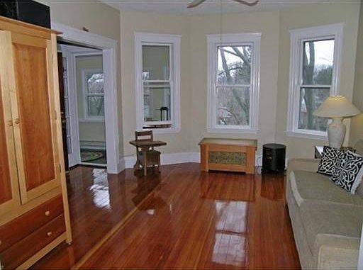 This sun-filled two plus bedroom penthouse unit, with over 1,000 square feet of living space, features an eat-in-kitchen with a breakfast bar, an open dining/living room area with classic plate rail, and a wonderful, heated sunroom overlooking a beautiful tree-lined street. Also offered are sparkling hardwood floors, large bedroom closets, a dryer within the unit, ample storage in the basement, and a covered back porch. All of the windows have been replaced. This property is close to a park, the Heath School, the Brookline and Chestnut Hill reservoirs, and the MBTA.