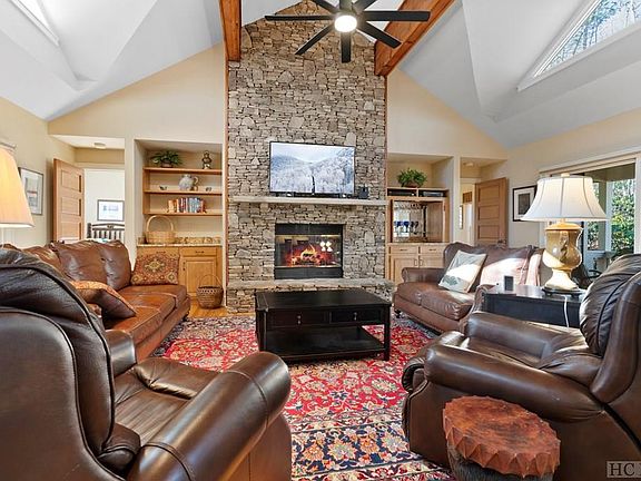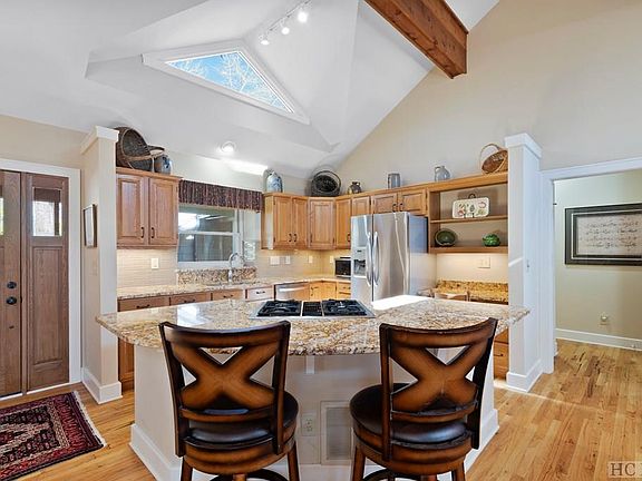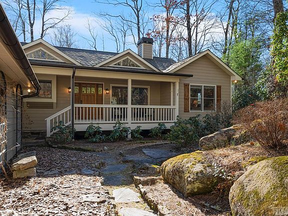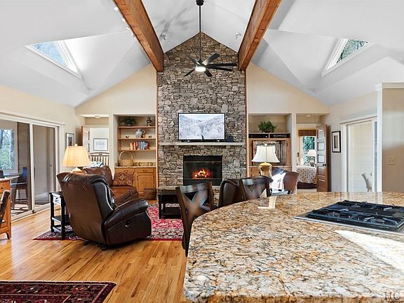 Renovated in 2017 by John Lupoli, one of Highlands premier builders, this spotless home is located in the highly sought after Cullasaja Club community and conveniently positioned between Highlands and Cashiers. This one level home enjoys a private setting on slightly over one acre and is in impeccable condition. With an open floor plan perfect for entertaining, gleaming hardwood floors, skylights and vaulted ceilings, this cottage lives large. The kitchen features stainless steel appliances, granite countertops, and a large island to accommodate family and friends while keeping the "chef" in the conversation. The vaulted living room with bar, built-in bookcases, skylights, and large stone fireplace opens to a covered front "rocking" porch and a large screened back porch with grilling area. Open the doors and enjoy the beautifully landscaped gardens and the peaceful sound of the water feature flowing into the Koi pond. The large principal bedroom suite also opens to the screened back porch and features dual walk-in closets, and large bathroom with dual vanities and large shower. On the principal bedroom side of the house is an additional half-bath, office area and laundry room with covered access to the large two car garage. The guest side of the home offers two ample size bedrooms with a large Jack and Jill bath. Large golf cart storage area is located under the home.