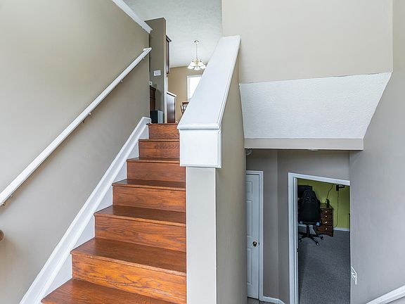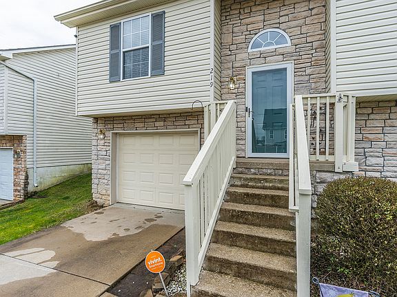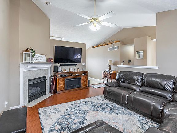 First floor features a vaulted family room with a cozy corner fireplace, eat-in kitchen, primary bedroom with full bath and walk-in closet. You will also find another bedroom and guest bath. New flooring in kitchen and primary bath! The lower level features another family room/den for entertaining guests watching sporting events or use as a home office! You will also find another bedroom, and half bath with laundry. New carpet installed in lower level! Enjoy the coming spring days on the back patio.