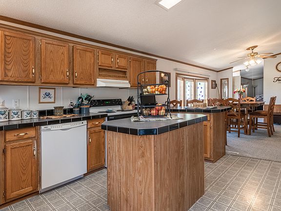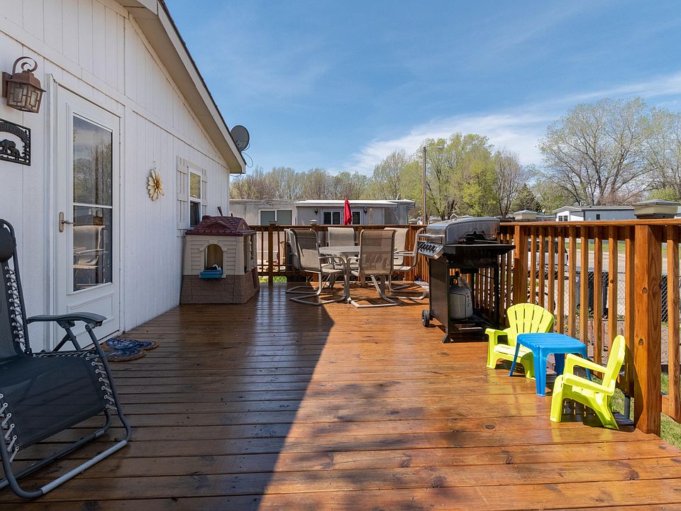 Enjoy perfect living in this Double Wide Manufactured Home with over 1600 sq. ft. on a beautiful corner lot with a fully fenced yard and no neighbors out your front door. You will love the large freshly stained deck to enjoy summer evenings entertaining or bring it inside. There is plenty of room to host everyone. The kitchen has a peninsula and a movable island and the dining area easily accommodates a table that can comfortably seat 8! The master suite has a separate soaking tub and shower. The yard shed is wired with 110 outlets and has lights. Contact a REALTOR to see it!