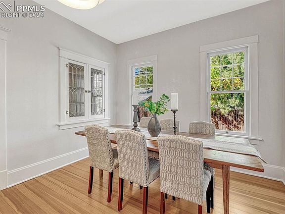 Discover the charm and character of this delightful Old North End cottage, nestled on a spacious lot that enjoys abundant natural light. This inviting home features two cozy main-level bedrooms, a dedicated office, a large kitchen, and two distinct living spaces. As you approach, the covered front porch beckons you to relax and take in the beauty of the surrounding mature trees and the unique historic homes of this wonderful community. Inside, you'll be greeted by the warmth of rich Douglass Fir floors, tall ceilings, and elegant details like new light fixtures, thick baseboards, and fresh paint throughout. The dining room is a standout, with a stunning built-in leaded glass cabinet. The south-facing addition continues the home's high-quality craftsmanship with oak hardwood floors, a cozy gas fireplace, vaulted ceilings, and large windows that flood the space with sunlight. Two French doors lead to a large back deck, perfect for entertaining or enjoying the expansive fenced backyard. This property also offers a versatile heated garage, currently used as an artist’s studio and a large unfinished basement. Zoned R2, this home provides endless possibilities. Experience the perfect blend of historic charm and modern comforts in this conveniently located bungalow.