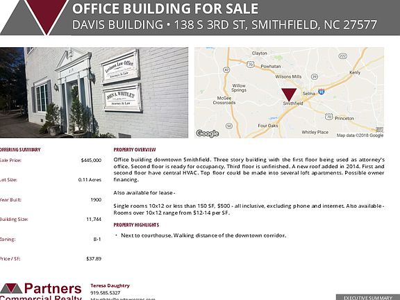For RENT/SALE For sale for $599,000 Whole building Office building downtown Smithfield. Three story building with the first floor being used as attorney's office. Second floor is ready for occupancy. Third floor is unfinished. Top floor could be made into several loft apartments. The Physical address is 219 E Johnston Street and 138 S Third Street, Smithfield, NC 27577. Single rooms 10x12 or less than 150 SF, $500- all inclusive, excluding phone and internet. Also available- rooms over 10x12 range from $12-$14 per SF. Next to courthouse. Walking distance of the downtown corridor. The site is improved with a three-story brick commercial building containing about 11,774+ square fee. The Johnston County property tax card indicates the building was built in the early 1900's. The first floor area consist of about 3,570+ square feet which is divided into two sections. One section, facing Johnston Street, is occupied by the Levinson Law Firm along with Attorney John Whitley and consist of about 1,840+ square feet. The other section, facing Third Street, is occupied by Son's Tailor Shop and contains about 1,730+ square feet. The second floor, containing about 4,102+ square feet is leased to the County of Johnston and is occupied by various divisions of county government. The third floor, containing about 4,102+ square feet is unfinished and is used for storage. A new rubber roof was recently installed in July 2014. The first and second floors have central HVAC. Building could qualify for historic tax credit with some paperwork and changes. We would need 1st month, last month, and one month security deposit for the property. The subject property is located in the main downtown business district of the Town of Smithfield. The Johnston County Court house is located in the same block as the subject. The Town of Smithfield Government Offices and the Post Office are located nearby. The subject property and most of the immediate area are developed as commercial properties consisting of banks, restaurants, retail stores, attorney and professional offices and a variety of retail and service type business. The downtown business district is typical of most towns with a majority of the buildings being older building that have, over the years, been renovated to more modern facilities. This area is served with a good highway system with US Highway 70 and US Highway 301 passing through the Town of Smithfield. Interstate Highway 95 runs through the eastern edge of the town. Also, the CSX Railway runs through the town. Schools, places of worship, shopping recreation and other amenities are located nearby or only a short drive.