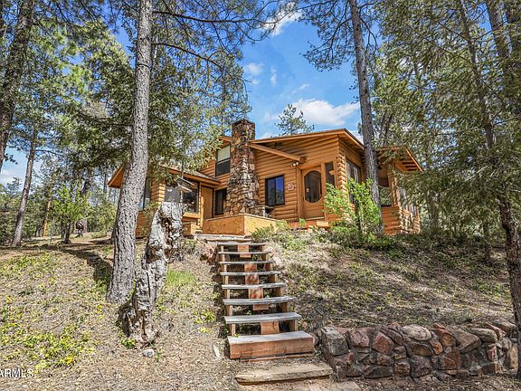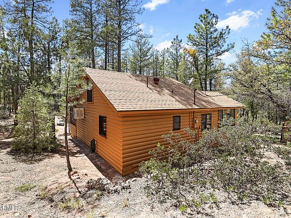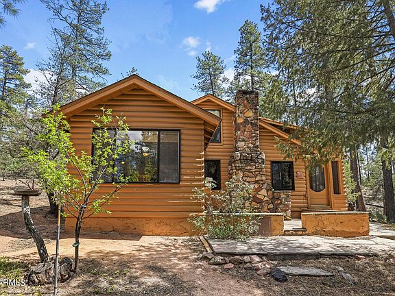 Seclusion, Serenity, and Enchantment describe the lifestyle you will discover at this well-preserved, and well-maintained, certified Historical Cabin that is nestled amid the towering pines in the much-desired community of Thompson Draw 1. Thompson draw 1 consists of 60 acres with 38 Homesites and 22 acres of common area. This cabin retreat is hidden away on a perfect one-acre lot, surrounded by more common area than most, plus this portion of the common area ADJOINS THE NATIONAL FOREST! This 2 bedroom, 1 bath, log-sided cabin with a beautiful stone fireplace has been refurbished from top to bottom. It is cozy, open, and it has the perfect rustic blend of wooden walls, vaulted wood ceilings, and engineered wood flooring. The roomy, eat-in kitchen is bright, open, and offers nice views .... the backyard and forest. The enclosed, screened-in front porch provides a wonderful place to relax and enjoy the crisp, fresh, pine-scented air in almost any weather. The loft (2nd bedroom area) can sleep four people. Other Features include a newer roof (1 year old) high efficiency dual pane windows, a solid, insulated kitchen door, three nice sheds (one with laundry hook-ups and one is used as a workshop) trash service through the HOA, and a community-shared well that provides an excellent source of fresh water that is tested monthly for quality. BONUS - This home comes COMPLETELY FURNISHED! (except for a few personal items), Don't miss this RARE OPPORTUNITY! (Short-term rentals are not allowed).