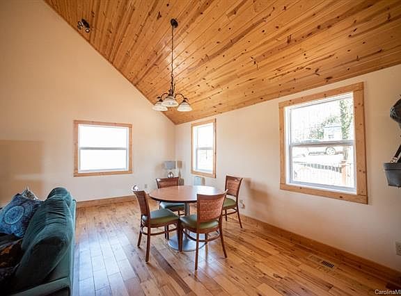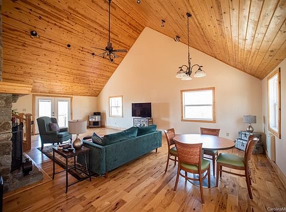 Great investment property. This one will make a nice vacation rental. Amazing views. Private 3 acres, but not too remote, you can be in downtown Asheville in less than 30 minutes. This home has so much potential. 3 bedroom septic, however it has 4 bedrooms, plus a media/ second living area with separate entrance on lower level. Could be a separate short term or long term rental. Gorgeous wood floors throughout, vaulted ceilings in the main living area. Lots of deck space for taking in the views. Beautiful stone, wood burning fireplace for cozy winter days. Large portion of the yard is completely fenced in to protect your animals. House needs a little TLC. Price is below market value and reflects those needed improvements. Driveway is gravel, all wheel drive is a plus. See walking tour video.