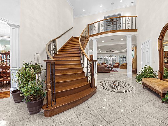 - Bar, Soaking Tub, Walk-In Closet(s), Tray Ceiling(s), Storage, Open Floorplan, Recessed Lighting, Pantry, Natural Woodwork, Granite Counters, Kitchen Island, His and Hers Closets, High Ceilings, Entrance Foyer, Eat-in Kitchen, Crown Molding, Coffered Ceiling(s), Chandelier, Built-in Features, Breakfast Bar, Beamed Ceilings