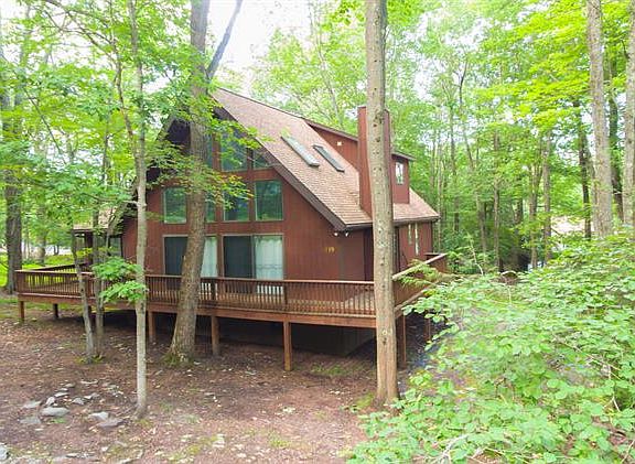 Technical lakefront with 25' direct access to beautiful 33-acre Tanglwood Lake and private community access to Lake Wallenpaupack! TOTALLY REMODELED 3 bedroom, 2 bathroom chalet. Brand new master bedroom and bath suite. Updated with new kitchen cabinets, appliances, and countertops. New floors and roof. Stone fireplace and sunroom. Newer heating and central A C system as well! Access to Paupack Hill's upscale country club and professionally-designed 18-hole golf course. Private access to Lake Wallenpaupack through Tanglwood's private 5-acre parcel which includes large pavilion, volleyball court, horseshoe pit, dock area with boat launch, and rare sandy beach area! Close to Interstate 84 and to town for shopping, dining, and more!