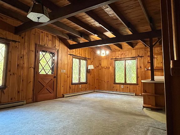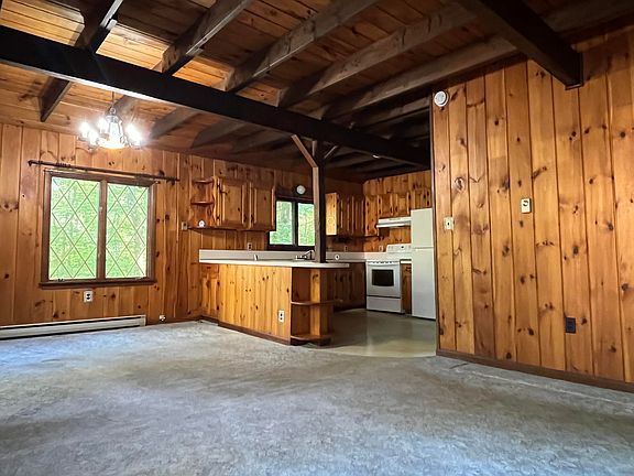 Home features a main floor with Knotty Pine throughout and exposed beams to give it that cozy cabin feel. Kitchen with newer appliances, bathroom and bonus room that could be used as another bedroom or office. 2 bedrooms on the 2nd level. A full unfinished walkout basement with wood stove waiting to be hooked up. Low maintenance metal roof and new storm door.