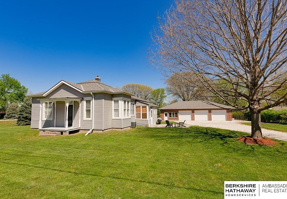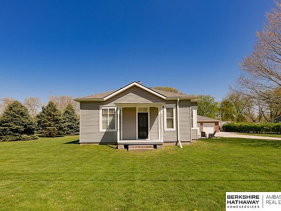 Small town living! Must see this move-in-ready, 1-story home located on a little under 1/2 acre flat, corner lot w/ mature pine trees for privacy. Fresh paint, new carpet, blinds, vinyl siding, updated kitchen w/ new cabinets, countertops, and LVT flooring. Beautifully updated bathroom w/ granite countertops/double sinks, custom cabinets and tile flooring. The detached, 3-car, oversized, all brick garage/shop with separate furnace is perfect for a car collector or small business... the possibilities are endless. Garage is 1590 sq ft with 10'4" high ceilings that contains a full bathroom & bonus room that could be used for a Mother-in-law/college student suite or office. Shop area has lots of cabinet and storage space with sink, stamped concrete floors with drain and hose hookup with access to hot/cold water. Home is within walking distance to Fort Calhoun Elementary School, community splash pad, & local restaurants. Appliances stay. Cash or Conventional. Sold As-Is. No HOA. AMA.