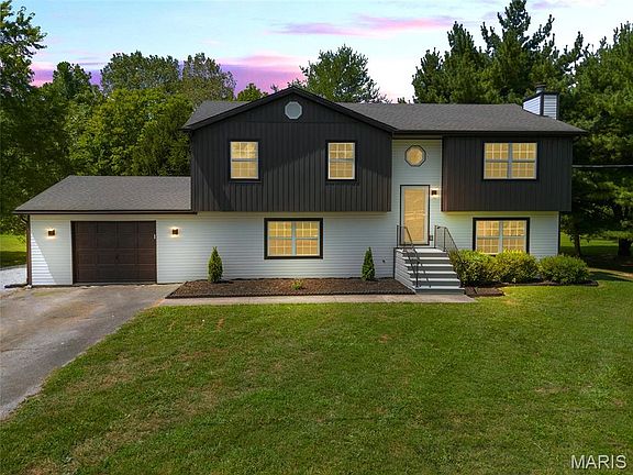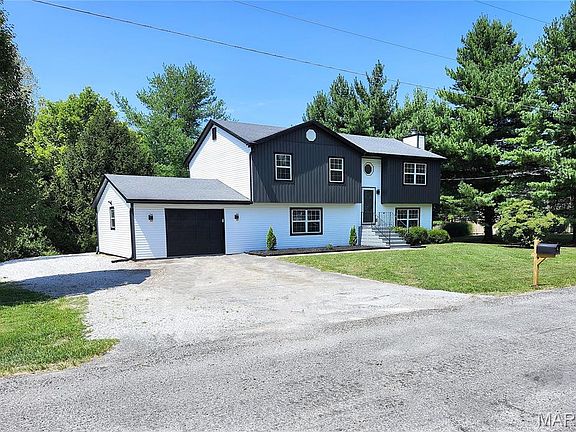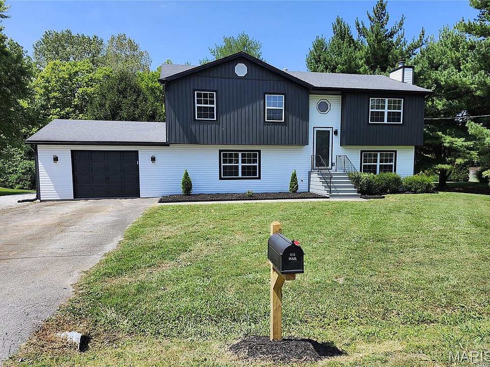 Plenty of room to "spread out" in this stunning 4 bed / 3 bath home, sitting on a semiprivate 2/3-acre lot. Over 2,000 sq ft of living space inside. Outside, you'll find a brand new 15x12 elevated deck with a great view of the big yard, AND a freshly poured covered patio. The whole exterior has received a total makeover. Oversized attached 1.5 car garage (23x18) with adjacent extra parking spaces. Inside, the seller has paid great attention to detail, using quality materials, such as consistent LVP flooring throughout, extra canned lighting (even in the closets), contemporary light & water fixtures, vanities, sinks, door handles & other accessories. Upon entering the foyer, a vaulted great room offers a living room w/ fireplace, a dining room, and an eye-opening NEW kitchen with granite counters, breakfast bar island, new soft close cabinetry & matching stainless appliances. This impressive home features TWO primary bedroom suites. One on each level, and both equipped with private bathrooms. One full bath and the other a 3/4 bath. Two more bedrooms share another full hall bathroom on the main floor. Downstairs boasts 2 more large gathering rooms. A family room AND a separate recreation - gaming - exercise room. Laundry room with room for storage and a walk outdoor to the backyard patio. The lower-level primary bedroom suite also has its own laundry facility built into the oversized walk-in closet. 20 minutes to Scott Air Force Base and downtown St Louis.