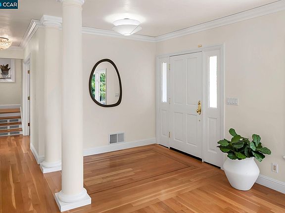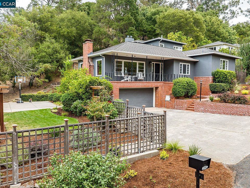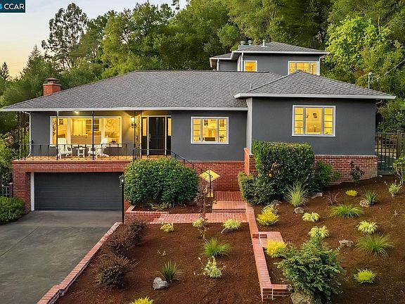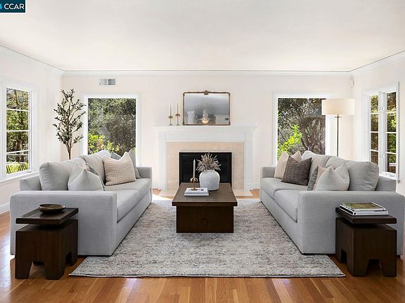 Spacious Glorietta home is ideally located, well removed from traffic noise and minutes to downtown Orinda, BART, Meadow Swim & Tennis Club and Glorietta School. A grand living room with a fireplace and a connection to an outside tiled deck welcome guests and offer an immediate venue for comfort and conversation. The kitchen features superior appliances, with ample storage and marble counters. The family room sits alongside, with elevated ceilings, garden views and another fireplace. One bedroom, which could be configured as an office, is on the main level. Two other bedrooms and a bathroom are up several steps, and the principal suite is located up the stairs on its own level. It offers another fireplace, remodeled bathroom, and spacious walk-in closet (with two entrances and ample cabinetry and shelving). The final bedroom, full bath, and a multi-purpose room (with garden access) lie downstairs, along with a lower level wine cellar. Other features include well-maintained hardwood floors throughout. Outdoors, a landscaped front yard welcomes visitors, and a side yard features a grassy play area, sport court, sitting area (under a pergola) and mature oaks. The oversized garage accommodates two cars and offers substantial storage space in addition.