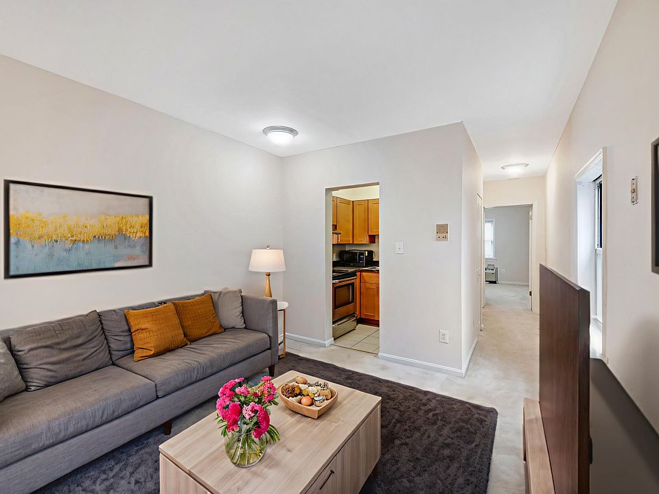Welcome to this spacious sun-splashed condo, featuring newer carpet throughout and a charming living area upon entering which offers design options to split with a dining area. Newer hardwood cabinets, stainless steel appliances, and tile floor throughout the kitchen make your cooking experience quick and easy. The bedroom to the rear of the apartment features large closet space, two windows, and plenty of space for a bed, dressers, and desk.