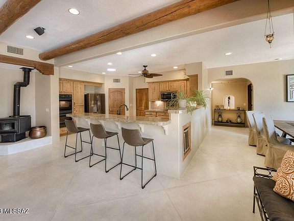 Beautifully Updated Santa Fe Home near Tubac with Upscale Shopping, Dining & Golf Resort/Spa. This Home Features 2,145 SqFt, 3BD/2BA, & Stunning Mountain Views on 1.1 AC. The Sparkling Pool, re-plastered in 2023, Waterfall, Poolside Cantina, & RV Garage Completes this Amazing Home. High Ceilings Throughout with Exposed Viga Beams, Interior & Exterior were Repainted in 2021, & Scored Concrete Floors were Recently Installed. Gourmet Kitchen includes Double Ovens, Built-in Wine Cooler, Granite Counters & Walk-in Pantry, plus Newer Refrigerator, Dishwasher & Microwave. 1,600 SqFt Pole Barn/RV Garage with 14-Ft Door & Loft provides Ample Space for your RV, Toys & Storage Needs. Top-of-the-Line Camera Security System & Rolling Security Shutters on Every Window & Door for Added Security if away. THE PROPERTY