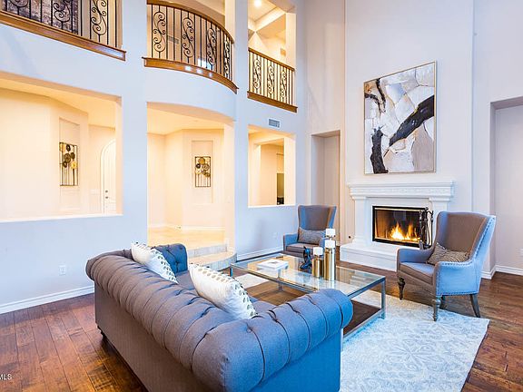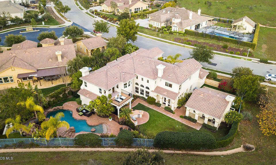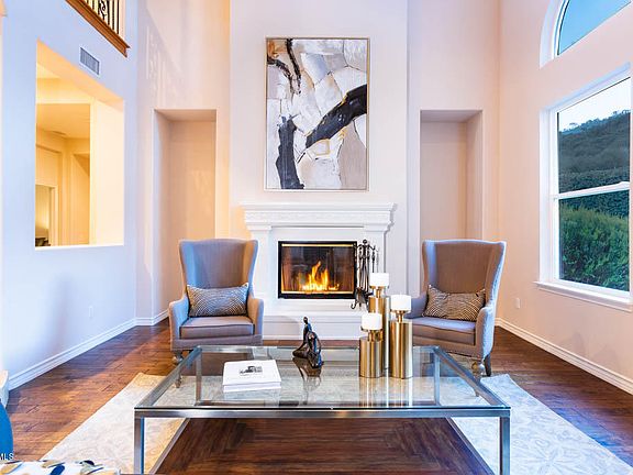 Your own private paradise...perfect blend of an Entertainers dream & functional family floorplan. Nestled among the hillside backing tranquil open space, this luxurious 5BD + office 6BA with detached casita pool home in Dos Vientos Ranch offers spectacular mountain views & over 5,000 sq.ft. of living space. The inviting entry way welcomes you to an elegant living room w/inlaid fireplace & soaring high ceilings, formal dining room, distressed hardwood & travertine floors, custom fresh paint, upstairs laundry room, downstairs bedroom/office & bath, bonus room, oversized 3 car garage & detached casita with private bath/kitchenette. Gourmet kitchen boasts spacious new quartz counters, updated backsplash & pendant lights, freshly stained cabinetry, walk-in pantry, stainless steel appliances & opens to the family room w/cozy fireplace & built-in entertainment center. Master suite offers an incredible private retreat with walk-in closet, large master bath w/granite counters, dual vanity sinks, oversized shower & jetted tub, & a balcony view deck perfect for enjoying the glorious sunsets. Entertain out on the resort style backyard with Saline pool/spa w/beach entry & water slide, built-in BBQ island/bar w/outdoor fridge, firepit, turf putting green & play court.