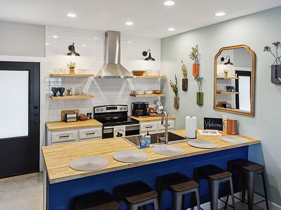 Step inside to find an inviting open floor plan where happiness greets you at the door. The living area boasts a plush couch, a cozy accent chair, and a smart TV, making it the ideal space for relaxation. With high-speed Wi-Fi, you can stay connected, whether for work or leisure. The fully stocked kitchen is a cook's delight, featuring a coffee maker, plenty of cookware and bakeware, and an electric stove with an oven. The large single bowl sink and ample pantry space add convenience, while the eat-up bar provides a casual spot for dining. A half bath just off the kitchen adds to the convenience.
