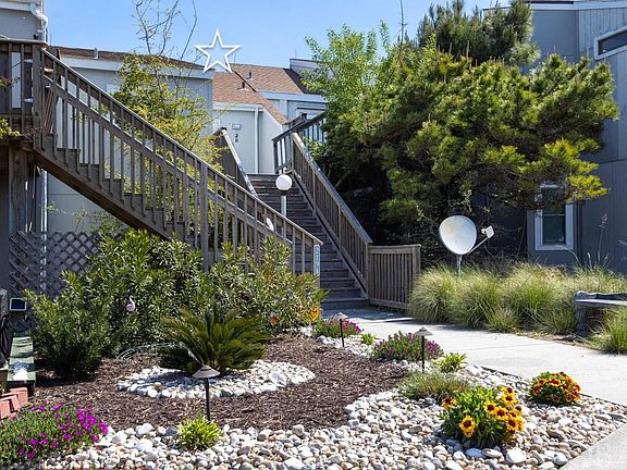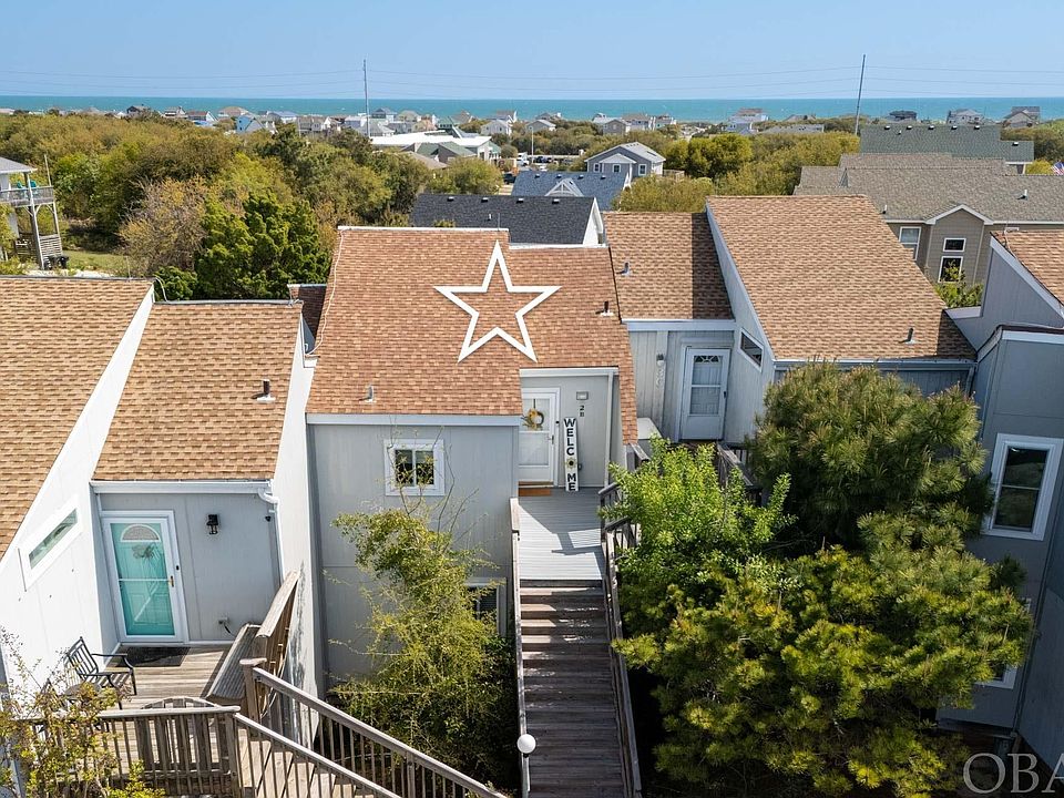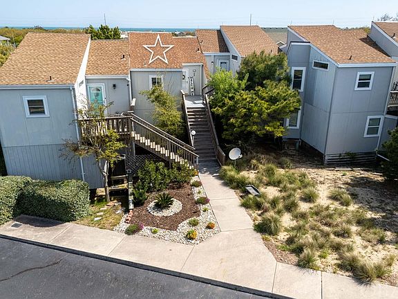 Welcome to this stunning townhome located in the sought-after Kitty Hawk neighborhood. Perched high on a hill with a short walk to Bay Drive's Sound access and soundfront walking and biking trails at Wright Brothers Multi Use Path. Take your Kayak, or Sup and enjoy Kitty Hawk Bay! Easy direct beach access at the end of East Tateway. With cathedral ceilings and an elevated position in the X preferred flood zone, this 3-bedroom, 2.5-bathroom home is truly a gem. Upon entry, you'll be enveloped in a bright and airy space filled with natural light, creating a sense of peace and tranquility. Despite being connected to neighbors, this home provides a secluded and private ambiance. Boasting lots of character, cathedral ceilings, custom windows offering sky views, and a reverse floor plan design, welcomes you with a bright and airy atmosphere. You will appreciate the abundance of natural light enhanced by custom windows throughout the home. The top floor features an open and efficient layout with a well-equipped kitchen, cozy dining area, powder room, and inviting living room that opens up to a spacious sun deck with views of surrounding trees. On the lower level is an En Suite Bedroom with a private deck and stairs that lead to the yard and outdoor storage area where you can put all your beach gear. Also on the lower level are two additional bedrooms sharing a bath with a tub perfect for small children. Elevated in the preferred X flood zone, this townhome offers peace of mind and serene views. Don't miss the chance to experience the relaxed Outer Banks lifestyle in this captivating home. Home Sweet Home projected a Year Round Rental Income of $2,350 a month, totaling $28,200 a year. This property is a great value and offers lots of character in a great location! A must see!