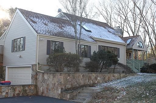 Stunning Contemporary Cape with cathedraled 1st floor Master with it's own bath is set back on almost 6 acres of privacy! Over 2600 sq ft of luxurious living! You'll love the gorgeous maple custom kitchen with granite counter tops, stainless steel appliances and built-in dining booth. Kitchen has a nice snack island that is open o a 23'x17' family room with gorgeous custom built-in cabinetry and entertainment center with sound system and speakers. There are French doors to a beautiful sun room, too! There's central air conditioning, a large and beautiful rear covered deck and a location like no other! This beautiful home was just vinyl sided, too..so no exterior maintenance! MUST SEE!