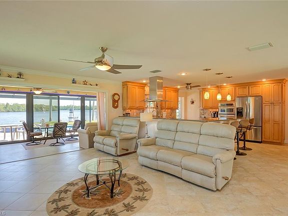 Panoramic Caloosahatchee River views throughout this private estate. This 1842sf, 3 bed, 2 bath, pool home, has been completely remodeled with open kitchen, dining and living room. Granite counter throughout this large kitchen with stone back splash complimenting the stainless steel appliances and 4 seat bar. Large pocketing slider open to the 56 foot long enclosed veranda. From the 616 sf enclosed veranda 6 impact sliders opens to the 1288 sf screened in pool area set with Clearview screen. Breathtaking sunset/sunrise ambiance views from the almost every location throughout the home. Additionally you will find a granite fireplace with electronic fireplace with lights and heat, 2 person sauna, colorful led lighting throughout patio and pool, waterfall spa into the pool, oversized 2 car garage with workshop. Situated on 3/4 of and acres there is plenty of room to roam, add an addition or detached Garage. Two RV pads. 13,500lbs boat lift will accommodate a 40ft boat fully covered, Wrap around dock with water and electric. There is a davit and an additional 80+ ft of seawall for boats. Many more bells and whistles this is a must see property.