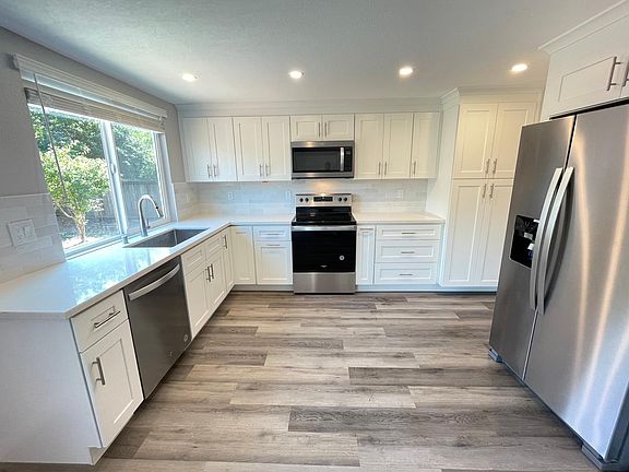 Gorgeous, completely updated 2-story home on lovely cul-de-sac in fantastic location in Pinole. Complete with brand new remodeled kitchen, all remodeled bathrooms (3), new floors, new paint, new windows, and new closet doors. The main level offers one bedroom and one full bathroom (just a couple steps to entry). The brand new kitchen features new cabinets, quartz counters, new sink, faucet, and new appliances. It's an open layout blending into the dining and living room (with wood burning fireplace), and leading directly to the deck/backyard for fun summer BBQs! The upstairs level offers 3 large bedrooms including the primary suite with en-suite bathroom and walk-in closet, and additional guest bath. Bonus HOME OFFICE space has been recently constructed and is ready for your WFH needs. The second living room offers a vaulted ceiling and spacious area perfect for hosting large groups, and for fantastic movie nights. This amazing home features a large yard with established Pear and Apple trees, a large deck, and ample room for your own garden beds and a play and entertaining area. The large two car garage has new lighting, and room for storage, and interior access. It leads right into a separate laundry room with washer and dryer and laundry storage. This home is on a large corner lot on a cul-de-sac sharing just two sides with neighbors and giving many off street parking spaces in front of the home in addition to the large driveway and large garage. The location is fantastic! Centrally located and very convenient, just a three minute walk on a trail to get to Pinole Valley Shopping Center! Just minutes to the freeway and Pinole Vista Shopping Center! And just blocks to good elementary schools, and pinole Middle school and High School. Message Jeremy Lebeau for viewing appointments, available for move in! One year lease with one month's deposit. Tenant pays for all utilities. Pets acceptable with owner approval.