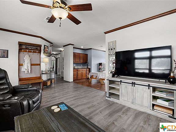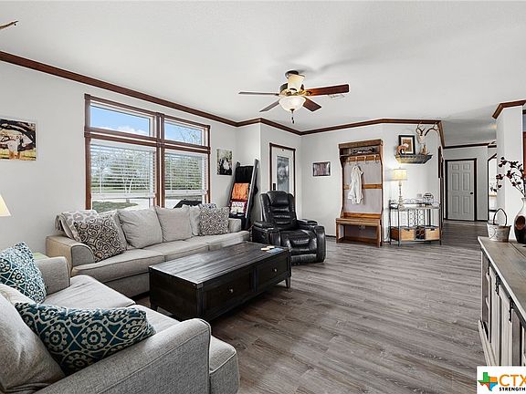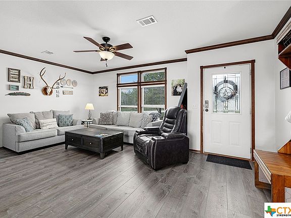 Welcome to country living... close to city conveniences! Less than 15 minutes from New Braunfels, this country home is ready for your 4H projects, horses and more! Over 5 beautiful acres of prime Texas land, covered with mature trees projecting beauty and privacy Fenced with a gated concrete entry and freshly refurbished driveway. Step into the inviting modular family home with ample space, including a secondary living area/ game room/ flex space! Granite counters and granite island kitchen ready for entertaining. Both bathrooms boast double vanity granite countertops. Step out onto the large covered deck and fenced back yard ready for family get togethers. Sellers have just installed new carpet in the bedrooms, new laminate wood look throughout the living areas, fresh paint and leveled foundation, new skirting, as well as purchased and provided a new inspection!