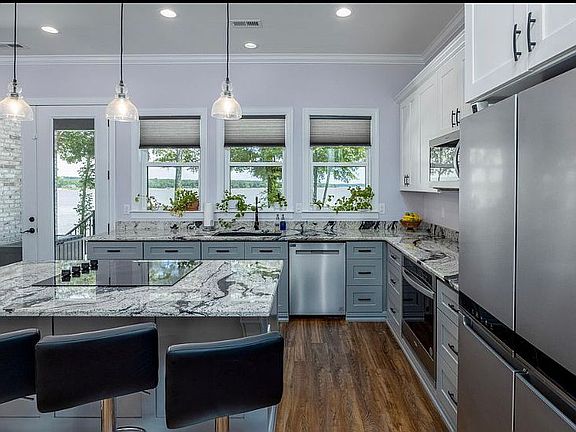 Gorgeous brick beautiful of main channel with retaining wall, large beach access, phenomenal sunrise and moonrise views across lake. Lot is completely fenced for your fur baby. Grand entrances with 10’ ceilings and 8’ doors only enhance its cottage like charm. Upgrades and LVL throughout make it a must see on your dream home checklist.