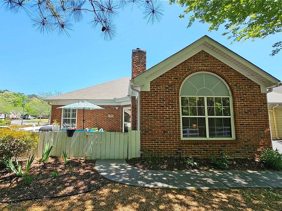Welcome to this delightful brick two-bedroom, two bath condo nestled in the heart of Stone Mountain and just a sneeze to shopping. This home offers the perfect blend of comfort and convenience. Once in the neighborhood, the home is accessed via a semi-private road where one can enjoy a tranquil setting of trees away from the bustling traffic. Then, enter the home through an inviting fenced patio, perfect for morning coffee. The fireside living area is open to the dining area and kitchen. Stylish strand woven bamboo flooring throughout is both durable and appealing. You must see the updated gourmet kitchen with granite counters, lovely tiled backsplash, eating bar and pendant lights. White cabinets above and green cabinets below create a modern contrast. Enjoy gas cooking, disposal and microwave. The laundry room is located off the kitchen and entrance to the two car garage. The kitchen and both bedrooms are equipped with ceiling fans for comfort. The hall bath features a walk-in tub with shower. The owner's suite features a walk-in shower ensuite ensuring privacy and convenience. Features include: easy to grasp, decorative door handles throughout; wired for security cameras; wired for indoor safety cameras; new electric fireplace insert (five months old); plantation shutters throughout; screen door with no-glare film; two fairly new ceiling fans; three outdoor sensor lights and washer & dryer included. Don't miss this one-of-a-kind opportunity to own a piece of Stone Mountain Tranquility.