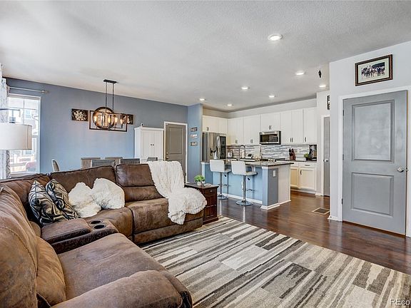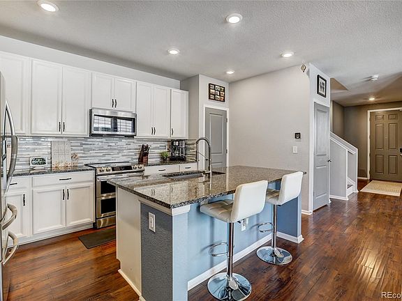 Rare and Beautiful 4 bedroom on the upper floor, 3 bath, 1980 sqft townhome with a main floor study and an additional 840 sqft in the unfinished basement with an attached 2-car garage. Stunning from bottom to top. This home has a fabulous Great Room concept with an amazing large kitchen featuring all new stainless appliances, slab granite counters, tile back splash and a huge center island with seating. The tall ceilings and durable laminate floors with hand planed detail create luxury unmatched by any other. Throughout the home there are designer light fixtures and recessed caned lighting, upgraded plumbing fixtures and huge windows. This home also has incredible outdoor living space that is hard to find in the Denver market. The big stamped concrete patio and small yard is a perfect spot for BBQ's and the dog. There is an upper level laundry room with included washer and dryer nestled near the bedrooms. With easy access to E-470, travel times to anyplace in the metro area are short and especially to Denver International Airport. This home truly is a hard to find combination of perfect.