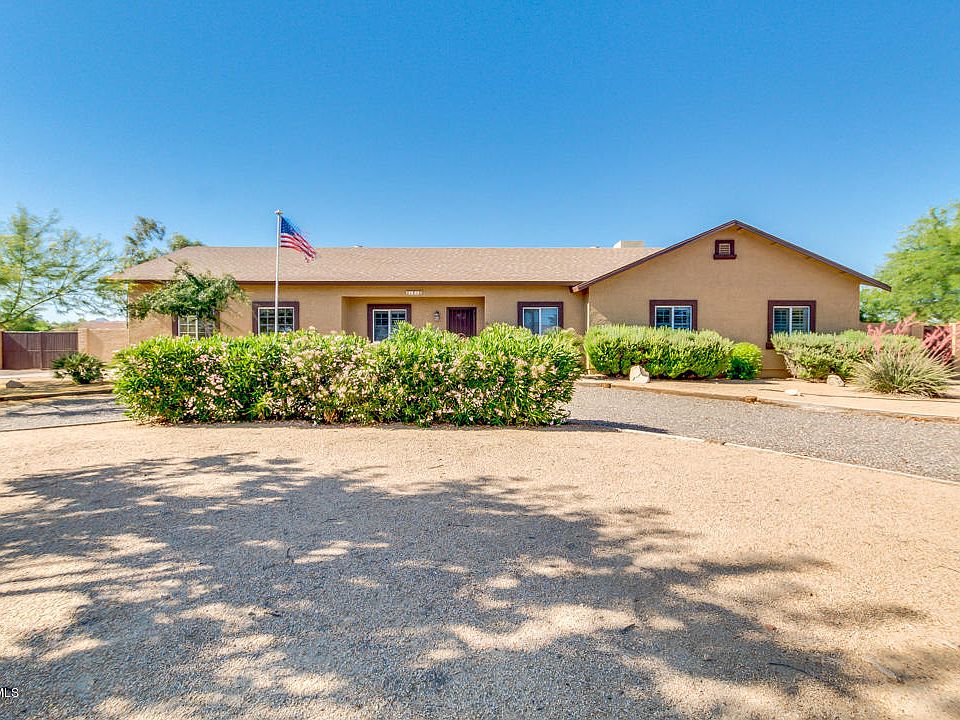 Don't miss this charming 1-story home on an acre with NO HOA! Featuring tile and laminate flooring throughout, custom shutters and a built in bench for your breakfast nook!The back patio overlooks your own desert oasis, and there is plenty of space for livestock and gardening beyond the enclosed pool area. The RV shop has insulation and is tucked away on the property with plenty of space for all of your toys!