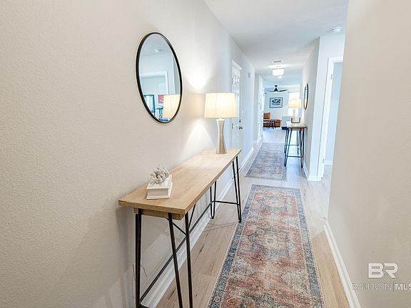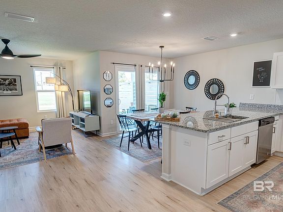Recent construction 4 bedrooms/2 baths, split floorplan. All new decorative light fixtures and ceiling fans, all new faucets, new LVP throughout (no carpet, no tile), blackout drapes on all windows, refrigerator with ice-maker, subway tile backsplash in kitchen, shiplap trim across front of kitchen bar, large dining area, custom tiled shower in primary bath with frameless shower sliding door, custom landscaped beds, enlarged patio area with custom-built slat privacy screening, quick walk from backyard to playground and pool. Fish River is just steps away. Seller is a licensed Alabama real estate agent. Buyer to verify all information during due diligence.