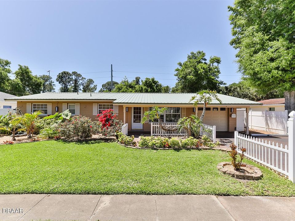 Curb appeal to beat ALL curb appeal! Amazing, colorful landscape greets you at this 4 bedroom, 2 bath home. Enter into the spacious Living Room with tile flooring. The Dining Room is conveniently situated in the center of the living space. The kitchen boasts stainless appliances including Refrigerator, range, dishwasher & built-in microwave & a breakfast bar. The Master bedroom has a private bathroom with a walk-in shower. There are 3 guest bedrooms all with ample closet space. The guest bathroom has a tub/shower & a newer vanity. Enjoy the enclosed porch for family gatherings, extra living space or a game room. Do not miss the beautifully landscaped backyard with pavered patio great for the bbq grill or fire pit. This home boasts a metal roof, Generac house generator, 3 large Sheds, sprinkler system & a white vinyl fence encompassing the backyard. HVAC 2022, Water heater 2019 & Metal Roof 2019. Located within walking distance to Publix, Dairy Queen, shopping & restaurants. All measurements are approximate and not warranted.