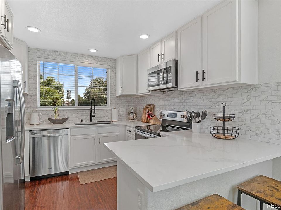 Stunning 2nd floor end-unit! Nearby University of Colorado Anschutz School of Medicine, DTC, Kennedy Golf Course, and Cherry Creek Reservoir and State Park. Highly sought-after gated community! Healthy, mature landscaping surround the property, creating a serene, park-like atmosphere that truly sets this community apart. Soaring vaulted ceilings! Featuring an updated kitchen, appointed with gorgeous quartz countertops. Open floor plan! Newer HVAC and Roof, recent home inspection report available (home is in great condition!), HOA covers exterior maintenance, common areas, pool, irrigation water, trash. Basking in natural light, the large primary suite is a true retreat, complete with en-suite bathroom and walk in closet. Cozy up by the sleek gas fireplace and watch a movie or enjoy happy hour on your elevated back deck overlooking the peaceful greenspace. Cookout by the sparkling pool and relax under the cool, towering shade trees. Enjoy the convenience of an attached one-car garage and plentiful surface parking just steps to your front door.