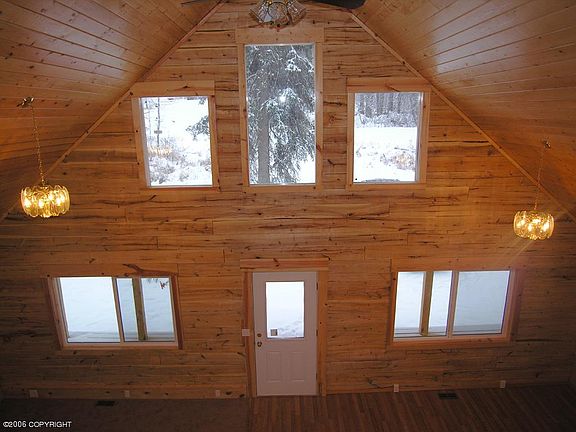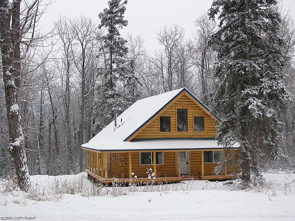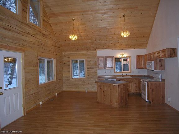 Log house nested on 1.12 acres w/small creek running thru back of property. Excellent commute to Anchorage. Seller can provide a garage kit for approx $16,000. Buyer could install for additional equity. Poured foam block foundation. Nice wrap-around porch, knotty pine vaulted ceilings, and open kitchen/living area. Very nice log home.