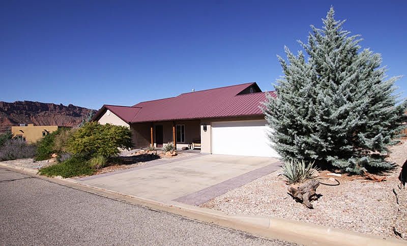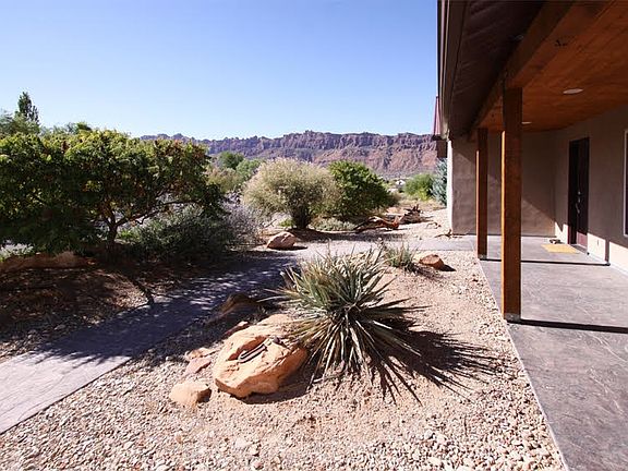 The high ceilings, and open floor plan, give a light & airy feel to this well maintained home located above town & close to the Moab Golf Course. Large Master Bath has separate shower & jetted bathtub. Covered patio off of dining room opens to a backyard with a peaceful setting; the mature trees offer privacy. Set up perfectly for outdoor entertaining. Separate studio or office (14 X 30) can be used for artwork, personal gym, man cave, or "she shed".