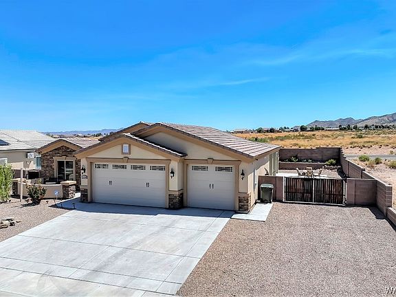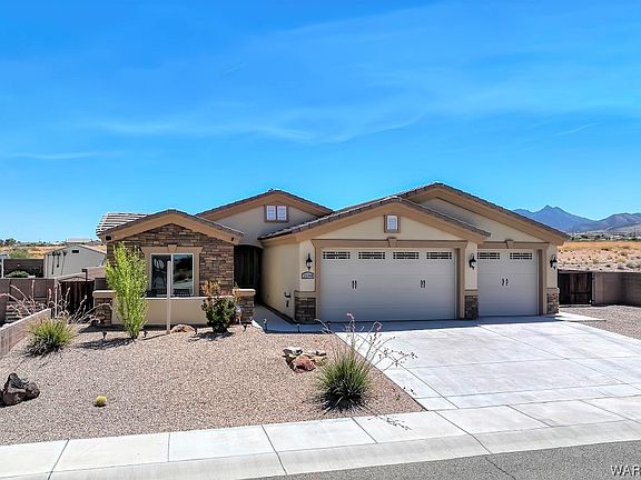 PUT THIS GORGEOUS HOME ON YOUR FAVE LIST!! This amazing home has some stunning features from the open floor plan, wrap around covered patio with views of the Hualapai Mts to the gas color flame fireplace in the living area and a kitchen with room for multiple chefs and designed for great entertainment! This comfortable abode is located on the outskirts of the Hualapai Shadows subdivision which is not far from Hualapai Mt Rd and within minutes of downtown nightlife and all other needed and wanted amenities Kingman has to offer. The great room, with flagstone and tile style hearth and mantle with recessed fireplace is the main focal point of this room, which opens into the kitchen and dining area for any size gathering! The kitchen with its granite counter tops deep sink, pantry, and oodles of counter tops would make anyone who loves to cook squeal with delight. The deep breakfast bar adjacent to the dining area helps expand seating and makes for a great prep space. The large glass sliding door off the dining area flows out to the wrap around covered patios (approx. 350 sq ft) and landscaped backyard. This space is amazing and so versatile and could be used year-round. At the side of the home, there is ample RV storage space with electric behind the dual iron gates on gravel. The primary bedroom of the home is very roomy with natural light from the east and has an adjacent bathroom with spacious tile walk in shower, dual sinks, and amazing closet space with storage shelves. This is a semi-split floor plan, having two private bedrooms with a generous bathroom in between. The laundry room has floor to ceiling storage for all those extra items we all have. You will love the 3-car garage area, one side 32 deep with metal sink and running water makes for a great workshop area or extended area for multiple vehicles, large truck, side by sides or boat! Don t wait, call your favorite Agent, and arrange a look today! You will not be disappointed!