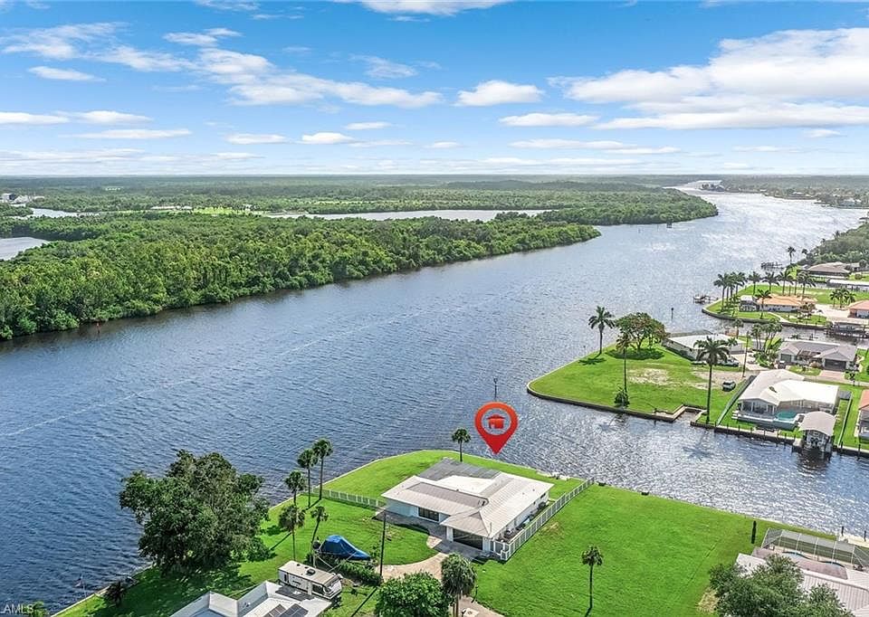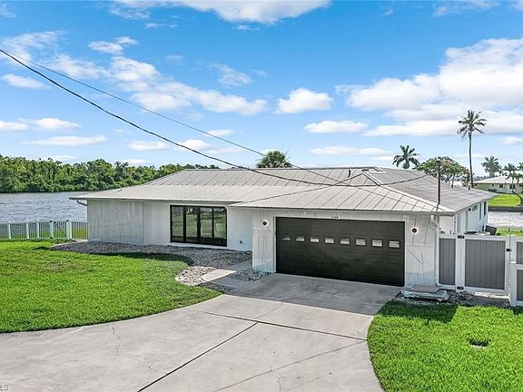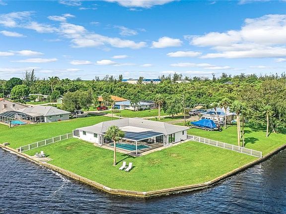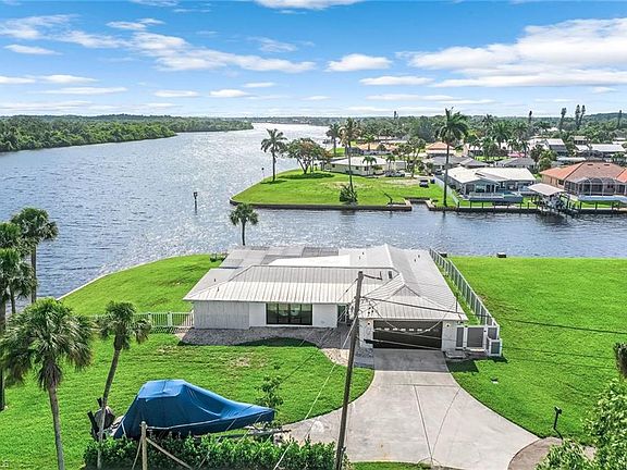 Discover the epitome of luxurious waterfront living with this stunning fully renovated home situated on a prime corner lot along the picturesque Caloosahatchee River, complemented by an intersecting canal that enhances its breathtaking views. This deep-water canal can accommodate yachts up to 100 feet, making it ideal for boating enthusiasts. Inside, the home boasts moisture-resistant drywall, entirely new electrical, plumbing, and HVAC systems, and elegant finishes throughout. Every detail is meticulously crafted, including premium PGT windows and doors with a custom black finish by Cypress Glass in Naples. The beautiful 24"x48" porcelain tile flooring extends throughout, adding a contemporary and durable touch. The dream kitchen features high-end KitchenAid appliances, a GE front-load washer and dryer, Kohler plumbing fixtures, and a unique flip-out kitchen window perfect for entertaining. A separate butler’s pantry and smooth face full wood cabinets accented by WAC art lighting add sophistication and function. Modern amenities include Onelink smoke detectors, programmable door locks, and showers equipped with both rain and standard showerheads for a luxurious bathing experience. Outside, the structural upgrades are equally impressive, featuring a reinforced LRE sea wall and foundation with foam injection for added strength and longevity. The exterior elegance continues with a complete new pool system, full screen panels with clear view screens, and a programmable exterior lighting system to set the ideal mood and ambiance. A comprehensive sprinkler system on well water ensures lush greenery year-round. This home represents a thoughtful blend of advanced technology, superior craftsmanship, and stunning aesthetic appeal. Whether entertaining guests or enjoying a tranquil sunset, this property offers the ultimate setting. Don’t miss the opportunity to own a piece of paradise on the Caloosahatchee River. Your dream home awaits!