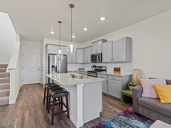Welcome to this beautifully paired home in Colorado, conveniently located just 10 minutes away from Buckley Space Force Base! With its open concept floor plan, this house is perfect for both comfortable living and entertaining. The main floor is bathed in natural light, creating a warm and inviting atmosphere that showcases the kitchen and living room. The kitchen is a chef's dream, featuring high-quality stainless steel appliances, a gas stove, and elegant granite countertops that add a touch of sophistication.