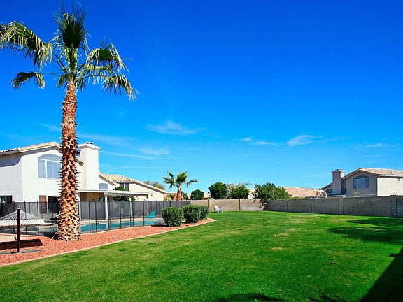 This charming 3 bedroom, 2.5 bathroom home offers great curb appeal and is situated on an oversized lot in Hillcrest Ranch. Dramatic vaulted ceiling entry way leads to the living room featuring a fireplace with stone surround. Other details include tile flooring & plantation shutters. HUGE grassy backyard with heated sparkling pool, spa, covered patio, palm and citrus trees and mountain views. Great neighborhood with A+ schools and close to the 101 Loop, Arrowhead and Westgate Malls, The University of Phoenix Stadium, Jobing.com Arena, and ASU West.