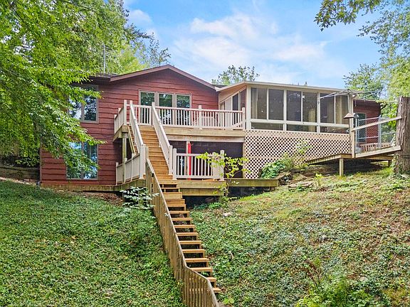 Welcome to the lakefront paradise you've been dreaming of! Nestled on a full acre with 120 feet of prime shoreline on Big Cedar Lake’s south shore, this property offers the ultimate lake life experience. This 1 acre features additional land across the street where you’ll enjoy a spacious 40x24 three-car (the size of a 4 car) garage, two sheds, raised garden beds, and plenty of parking. A third lakeside shed is perfect for storing all your boating and water toys. This charming ranch with a finished walkout basement features breathtaking lake views from nearly every window and two expansive decks. Inside, you’ll find 3 bedrooms (two on the main level, one on the lower), 2 full baths, and a massive 35x28 living room designed for entertaining—complete with a bar area. Start your day in the 20x14 three-season room with stunning views as you sip your morning coffee. Enjoy Big Cedar Lake’s ski-friendly waters from 1-4 pm daily, with access to Little Cedar and Round Lakes as well. Two metal piers are included and ready for your boats. With kitchen appliances included, a new HVAC (2016), and water heater (2020), this home is move-in ready. Well water and public sewer complete the package. Don’t miss the opportunity to explore this beautiful lake home—schedule your visit today!