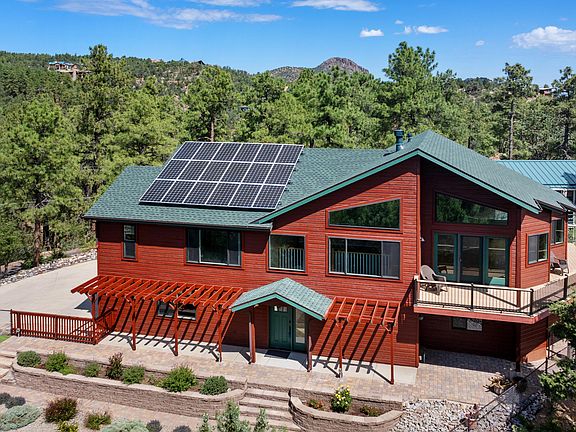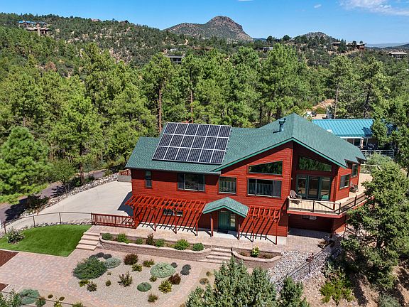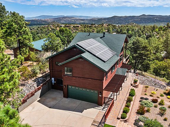 Brave the steep driveway for magnificent unobstructed views to the San Francisco Peaks from this light filled home with open concept, and grid-tied solar for economy and energy efficiency! This three bedroom, two bath, 3504 square foot home in the pines in Rancho Vista Hills has two levels and has been updated and upgraded through the years including grid-tied solar, roof new in 2023, all new dual-pane windows and screens in 2020, window coverings, composite deck surfaces, and much more! The entry level offers a spacious foyer, full bath, and large multipurpose room with private entry and deck. Possibilities are endless! Teen hangout, game room, in-law unit, exercise or art studio, office. A spacious laundry room with utility sink and storage cabinets will accommodate either an electric or gas dryer. The 2 car garage and heated and cooled separate workshop round out this level's features.
