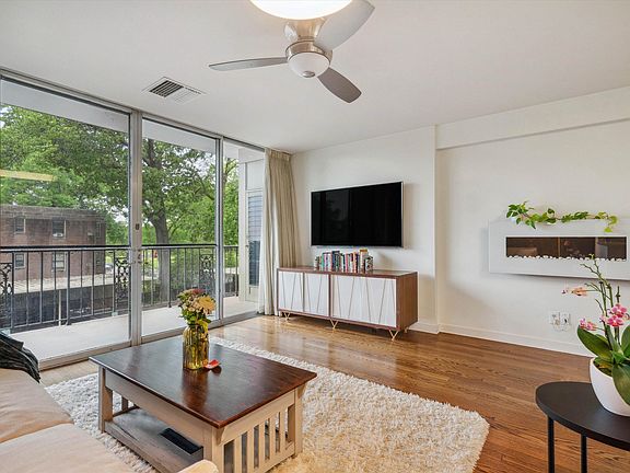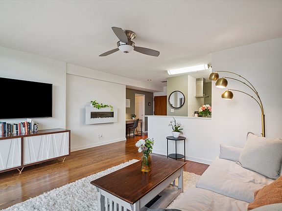 Mid-century style Condo. Price Reduced - Great natural lighting and park view from balcony. 1 covered parking with gate. HOA covers all utilities except electric, so SUPER low utilities. Fridge & W/D stay! Updated kitchen w white cabinets, Quartz countertops, SS appliances, Single basin sink. Laundry in unit. Cozy electric wall fire place; open kitchen to living room with breakfast bar. Great closet space- Custom Walkin closet in bdrm. Gunite pool. Gym and storage unit in basement. Average utilities $40/month; 1 covered parking spot(#44); gated; Desk area/HW floors in Living Rm; Balcony/Pool; 1 storage unit. Motivated Seller!