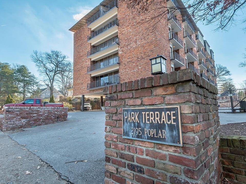 The coveted 08 unit in Park Terrace! This 3BR/2BA is the most desired floor plan due to its rear facing - furthest from Poplar Ave. - and split bedroom orientation. All BRs have access to one of 3 balconies facing E, S, and W to ensure a peaceful experience. The south facing balcony is 24' wide! Strictly owner occupant , secure bldg., with cameras at all entries, gated parking - 2 designated spots one covered - pool, gym, individual storage unit, and party room. Walk to the Square, shell & park!