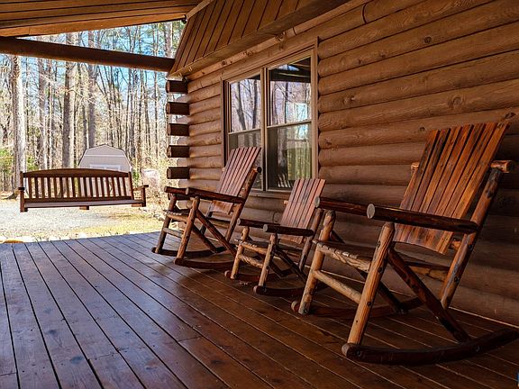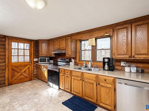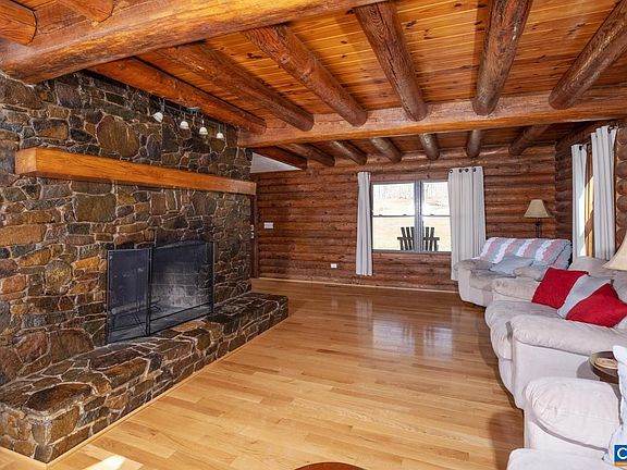 Complete Privacy just minutes from Cville! Well maintained 4BR log home nestled into mature hardwoods. Living room w/ exposed beams, gorgeous wood burning fireplace w/wide hearth and stonework. Full size kitchen has updated stainless appliances, back door opens to a deck for your grill. Generous dining room, Bella wood floors, rustic log walls, crown molding, quality finishes! 3 bedrooms upstairs including oversize primary with heart pine floors, walk in closet, & skylights. Finished walkout basement: huge family room w/fireplace, brand new carpet, 4th bedroom. Dual zone HVACs replaced in 2019 w/smart thermostats. Fast internet: 80mbps via Brightspeed, Firefly fiber optic upgrade available immediately. Call your realtor today to see this turnkey home!