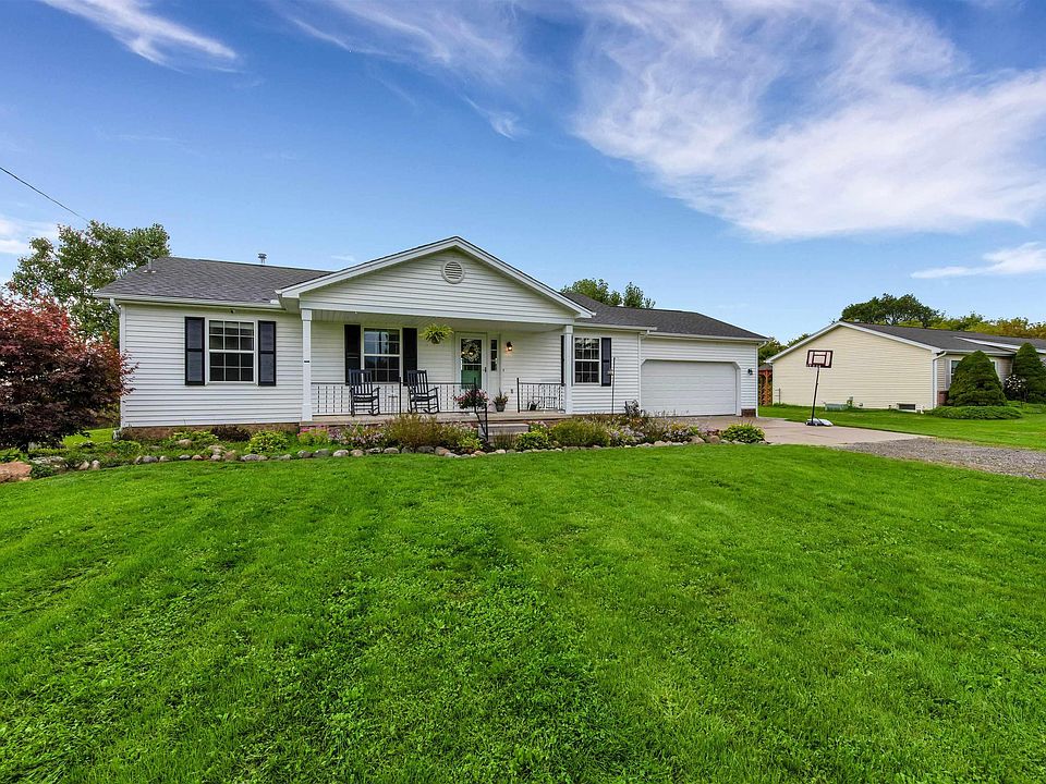 ALL OFFERS NEED TO BE IN BY 7PM ON SUNDAY 9/17/23!! This charming ranch is located in a beautiful country setting, with a large front porch, three bedrooms, 1.5 baths, and main floor laundry. The living room and garage are piped for pellet/wood stove. The partially finished basement has plenty of room to entertain. Features include a new furnace with whole house humidifier and A/C, new reverse osmosis water system, beautifully maintained flowerbeds and landscaping, pool for hot summer days and large deck and storage shed all in fenced in yard. Close proximity to expressways and shopping makes this home an easy commute from anywhere! Schedule your showing today! Appliances are negotiable.