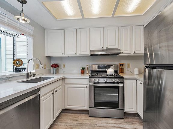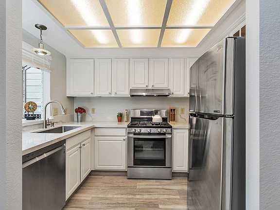 Remodeled 2bed/2bath, two-story townhome close to shopping & dining. At 916sqft, the interior features radiant heat, wood-look tile flooring throughout 1st level, new carpeting and fresh paint inside & out. The kitchen sparkles w/LG stainless appliances & quartz counters. A cozy livingroom has access to a charming fenced patio & 1 car attached garage. A large upstairs bath has quartz countertops, dual vanity w/undermounted sinks & walk-in shower.